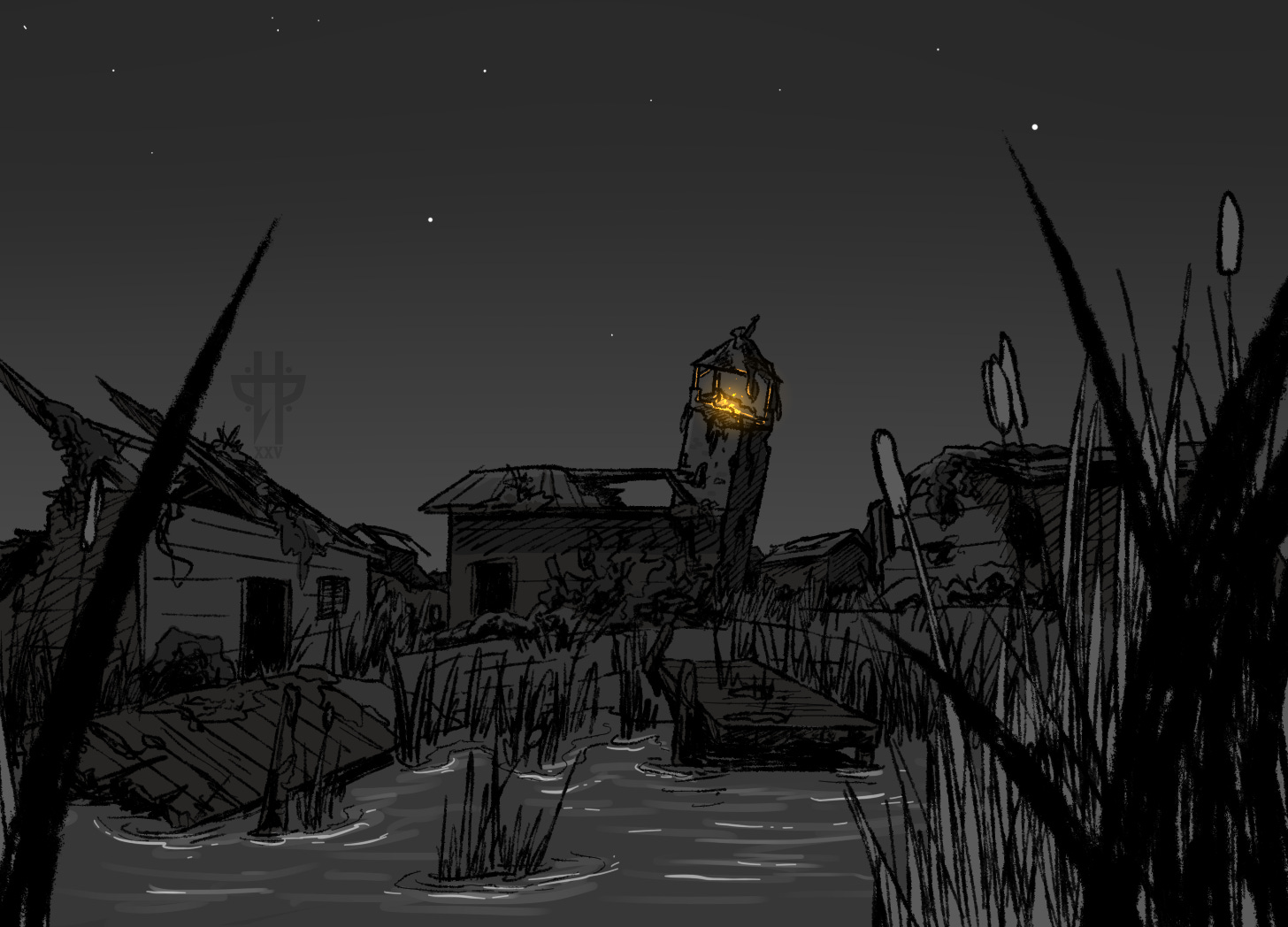 A Circle such as this could only support a handful of families. Many of the wooden structures had been reclaimed by the marsh, or claimed by something worse. Kanno needed to get closer to assess the town before they approached the only sign of life they could spot. That lonely fire flickered in the tower’s peak.